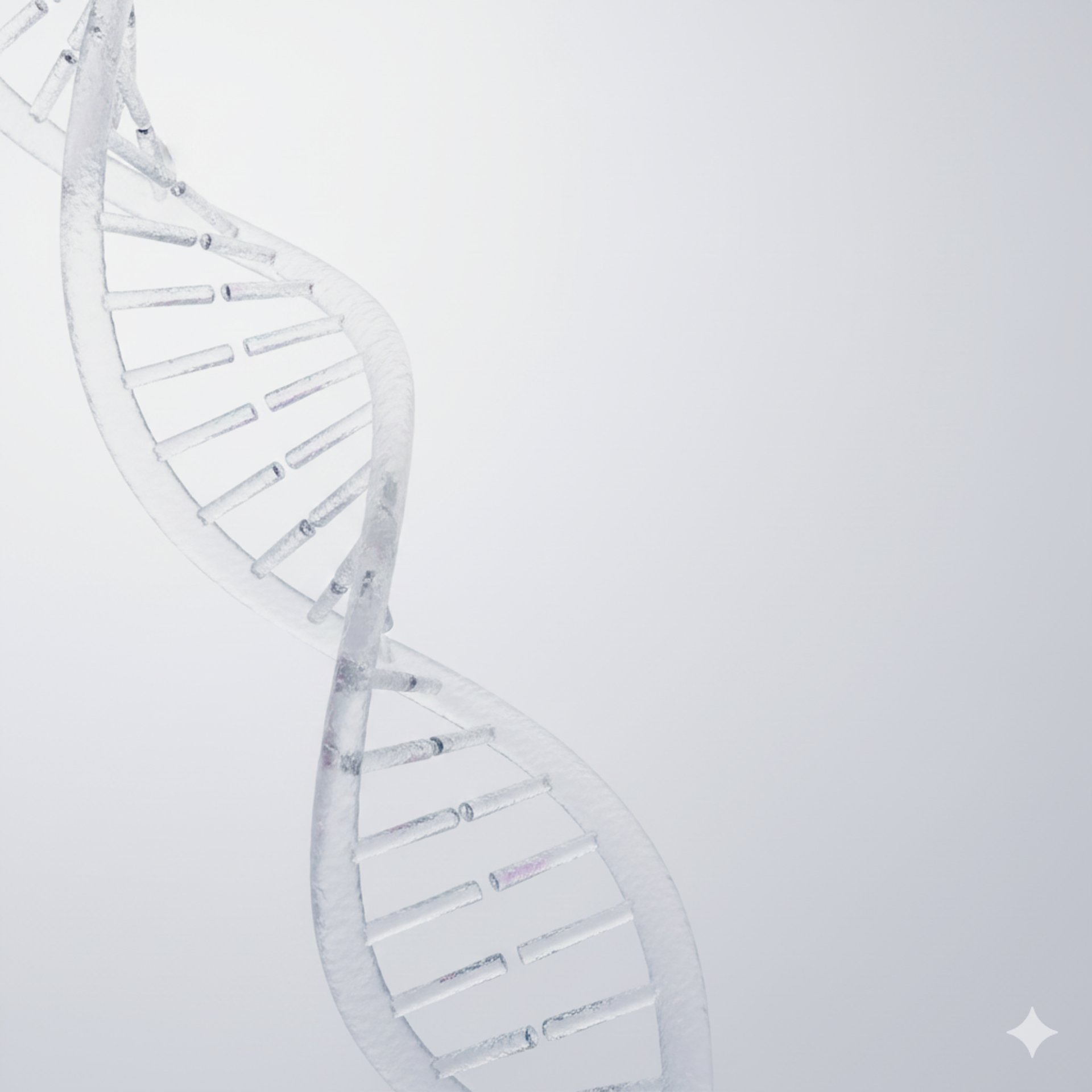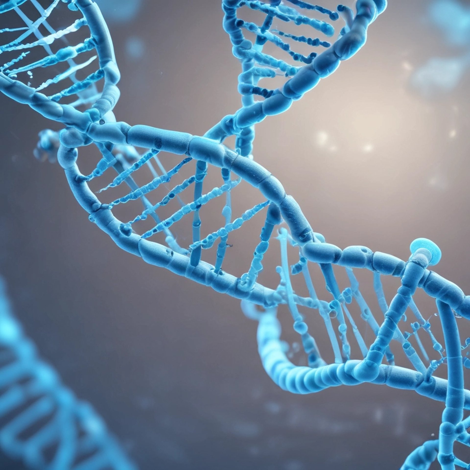 A close-up 3D realistic image of a translucent rotating DNA helix with blue clinical lighting and microscopic particles floating around.
